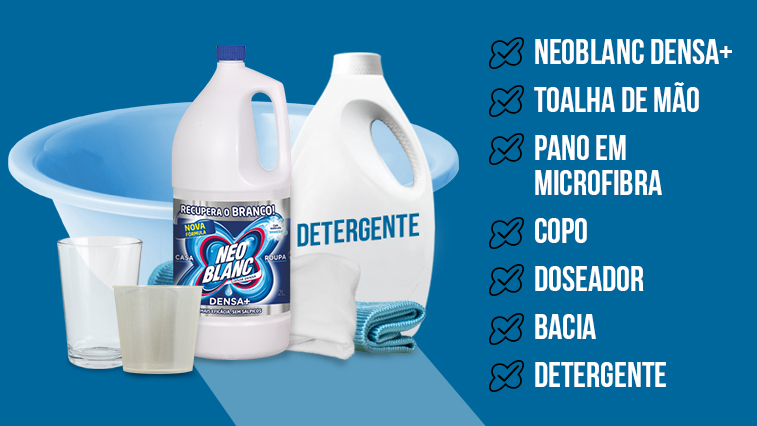 NEOBLANC Densa+ no compartimento da pré-lavagem. No caso de tecidos coloridos, sintéticos ou delicados, deite 1 tampa doseadora de